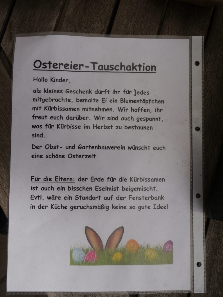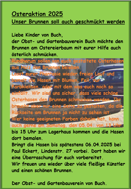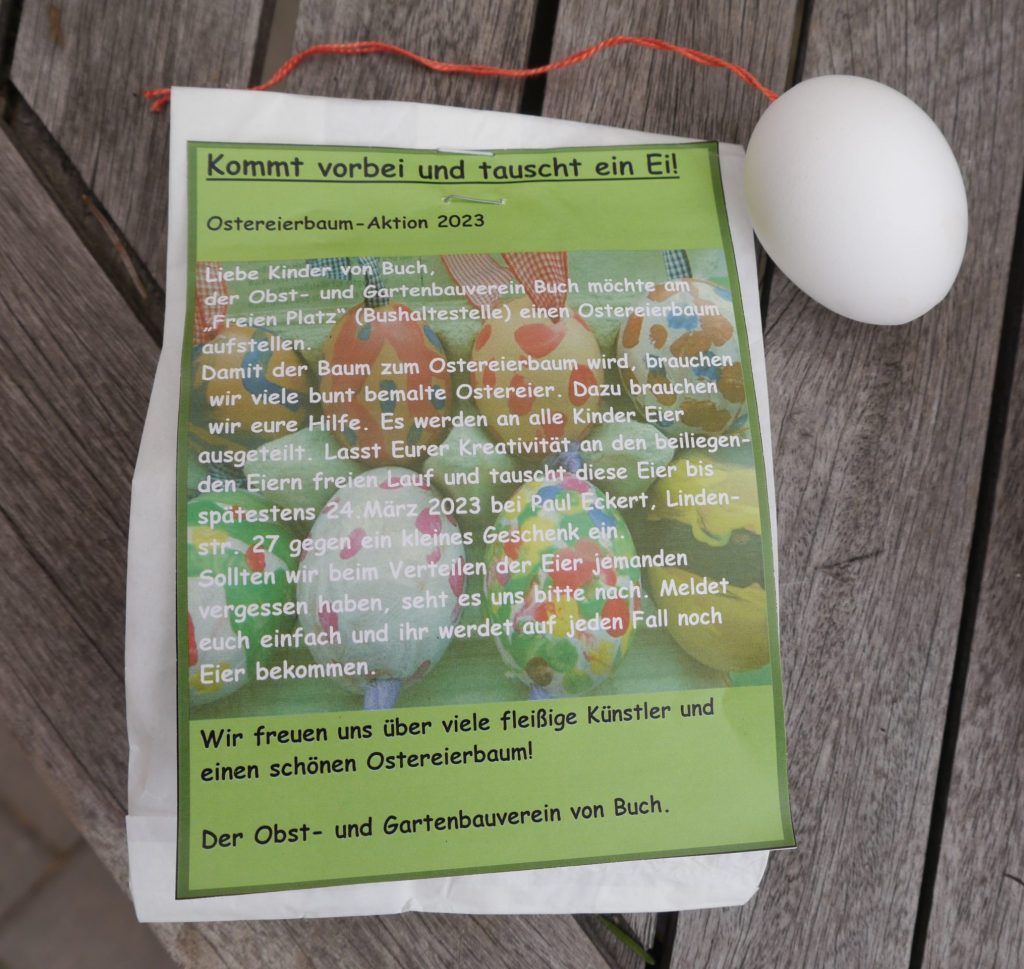 Ostereierbaum 2025Für den Ostereierbaum wird auch in diesem Jahr wieder gebastelt! Ostereierbaum 2023 Viele Kinder haben bei der Ostereierbaum-Aktion tolle und bunte Ostereier gestaltet. Um die 50 Ostereier haben zur Osterzeit den Baum geschmückt. Vielen Dank an die fleißigen Künstler. Wir haben uns sehr über eure Unterstützung gefreut!