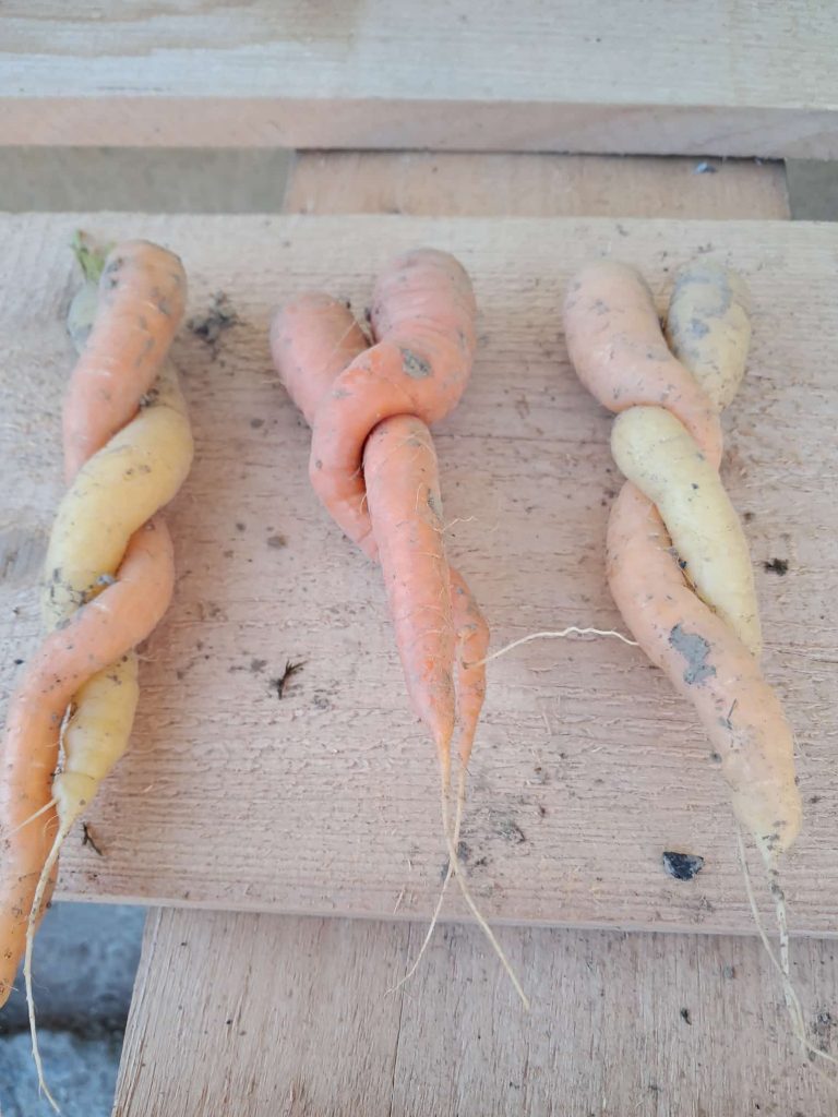 Schmunzeln Staunen Eng umschlungen, die Karotten von Josefa mögen sich! Siamesische Zwillinge sind bei vielen Obst- und Gemüsearten zu finden.